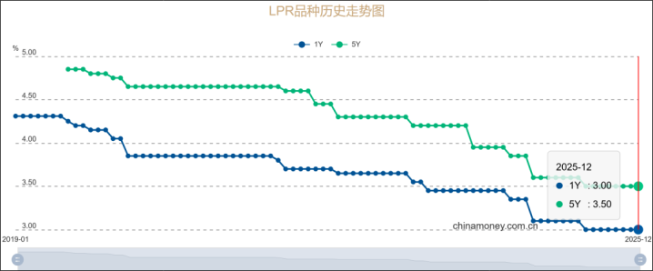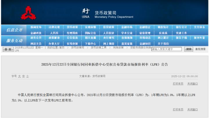 12月22日9时,中国人民银行授权全国银行间同业拆借中心公布,2025年12月22日贷款市场报价利率(LPR)为:1年期LPR为3.0%,5年期以上LPR为3.5%,均维持不变。
